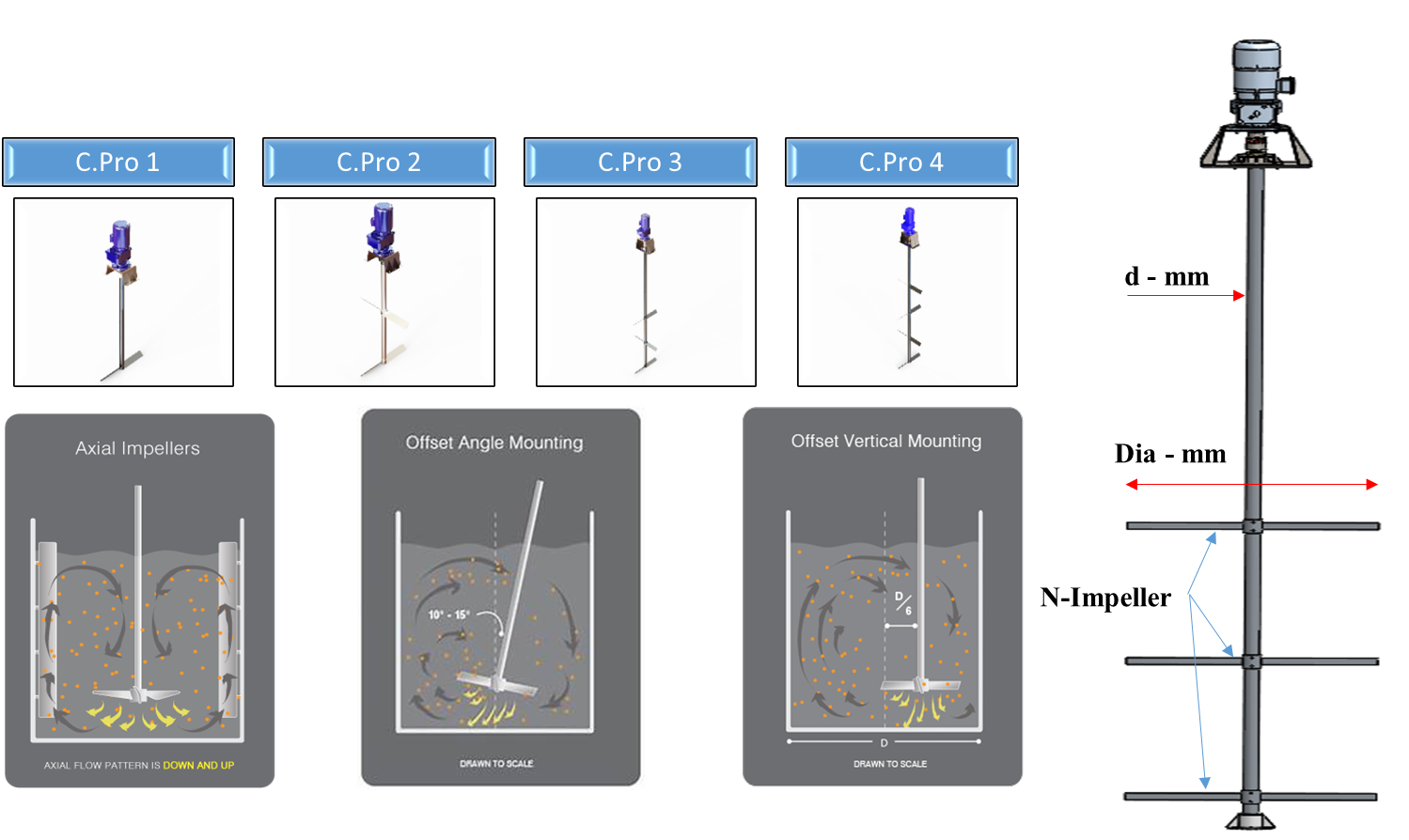 | C.pro | 500 | 2 - 4 | Model: C.Pro - Dia - N Material: SS304, SS400-FRP Type: Centrifugal Propeller Output speed: 75 - 120 rpm Power: 0,37kW - 37kW Application: High speed , Flocculation |