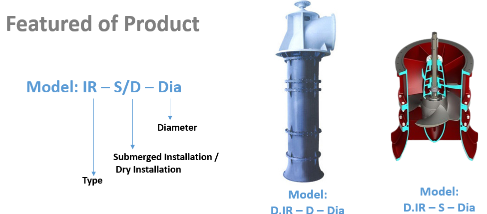 | IR | S/D | 250-300 | 1,5 | 72 - 648 | IR : Reculation System S/D: Submerged/Dry Installation Dia: Diameter of Pipe P: Power of motor. 1,5 - 3,7kw |